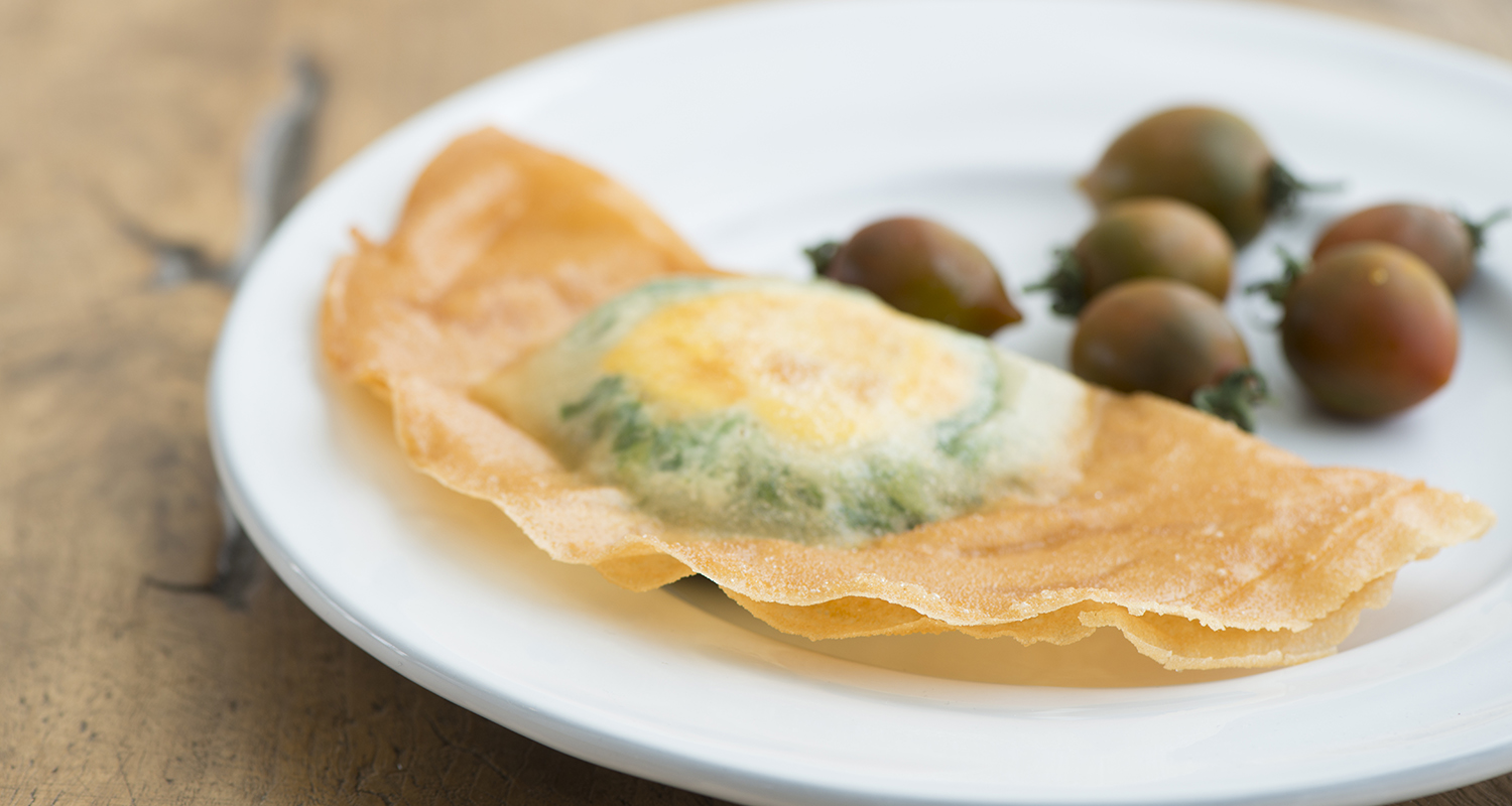 במרכז העלה העליון מניחים בערך 2 כפות מתערובת התרד והריקוטה במעין מעגל ובתוכו מניחים בזהירות חלמון ביצה.