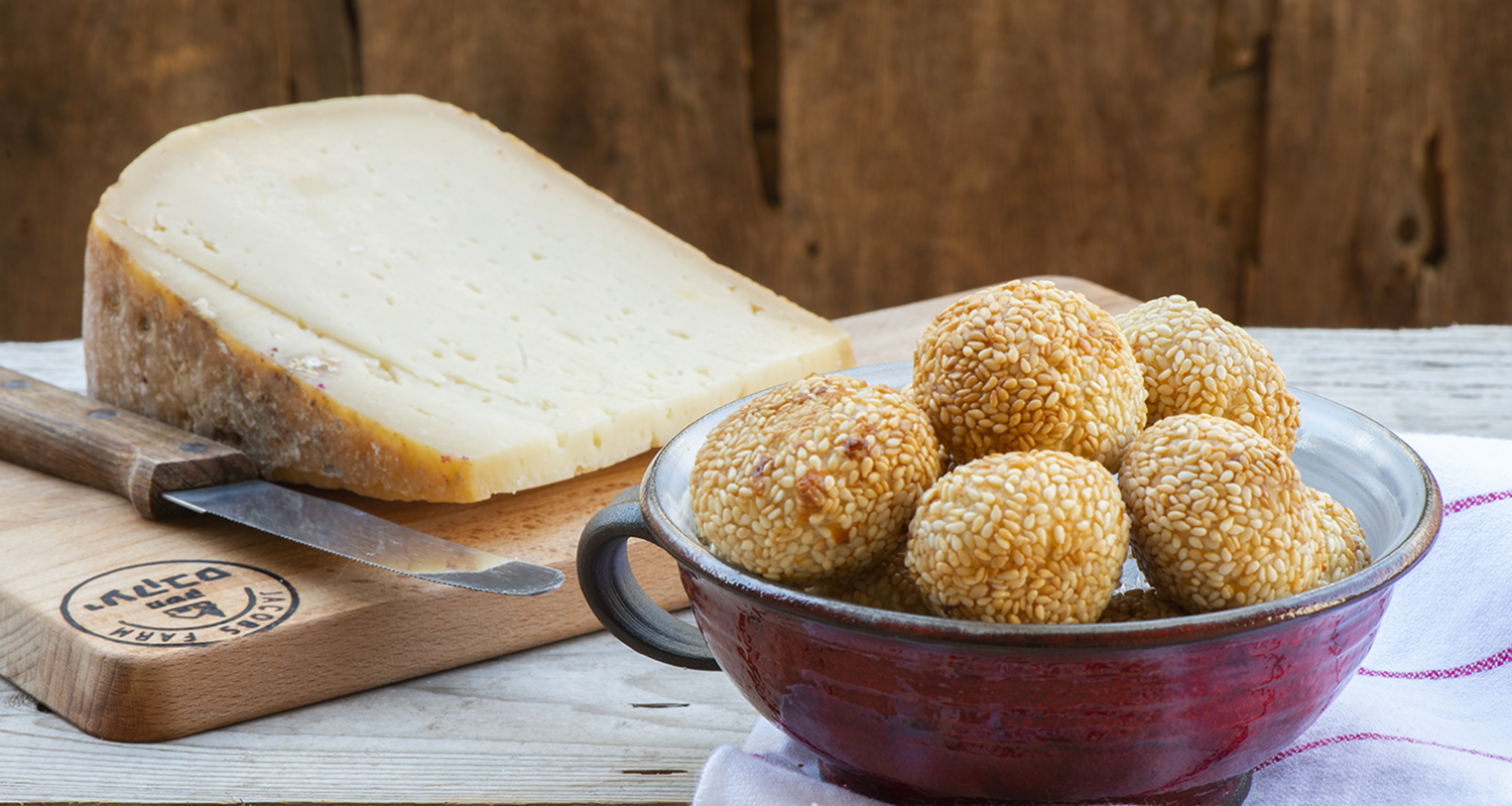 מחלקים את הבצק ל-30 כדורים בגודל פינג-פונג ומשטחים. מניחים זית במרכז ומכדררים בין כפות הידיים לכדור העוטף את הזית. מניחים בתבנית במרווחים של כ-2 ס”מ, מברישים בביצה ומפזרים מעל גבינה אלפינית מגוררת ושומשום.