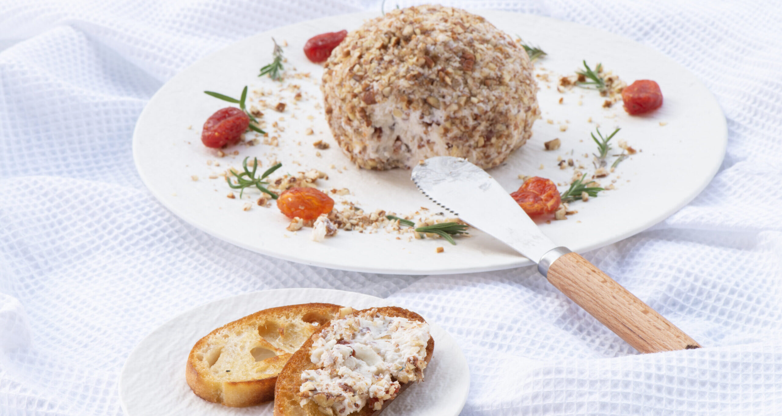מניחים בקערה את גבינת השמנת, גאודה מגוררת, בצל קצוץ, עגבניות מיובשות מסוכרות קצוצות לפיסות קטנות, מיץ לימון, מלח פלפל ורוזמרין.