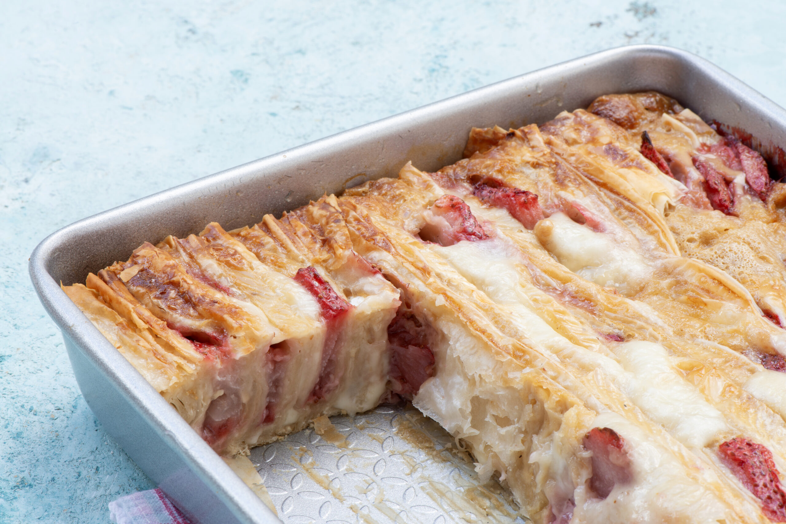 מסדרים את המניפות זו אחר זו. פורסים את הקממבר לפרוסות וכך גם את התותים. משחילים בין דפי המניפה פרוסות קממבר ופרוסות תותים. מברישים עם חמאה מומסת, כולל בין דפי המניפה. מערבבים את רכיבי הרויאל ומוזגים על המאפה. מכניסים לתנור לכ-30-40 דק' ב-190 מעלות צלזיוס.