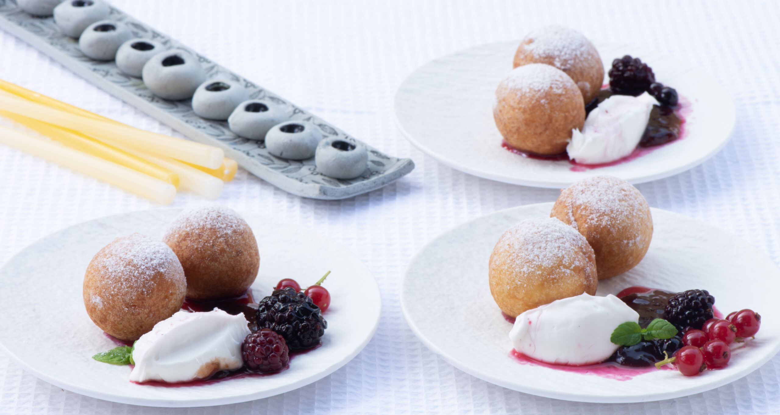 מגישים עם ריבה טובה או רוטב פירות יער וכף קרם פרש.