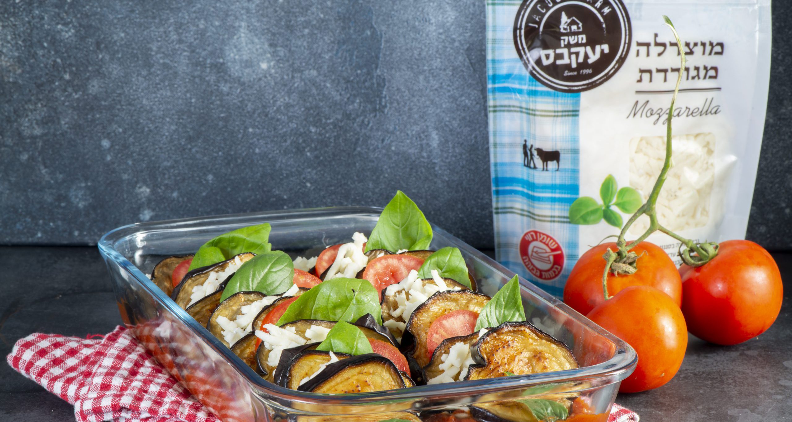 מניחים על הרוטב פרוסה של חציל, מוצרלה מגוררת, פרוסה נוספת של חציל, פרוסת עגבניה ועלה בזיליקום וחוזרים על הפעולה עד מילוי התבנית.
