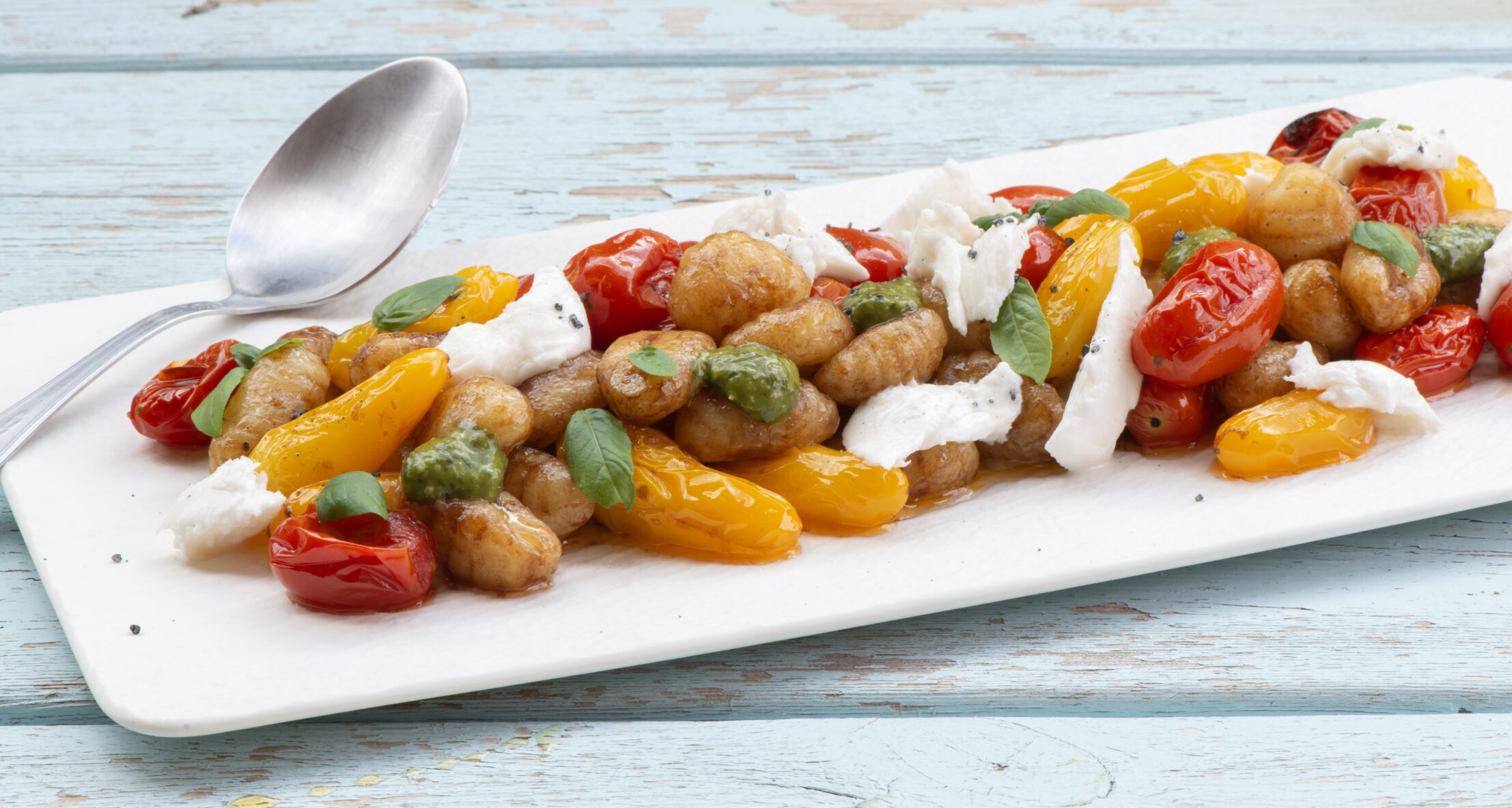 מניחים בתבנית את הניוקי המבושל ועגבניות השרי הצבעוניות.