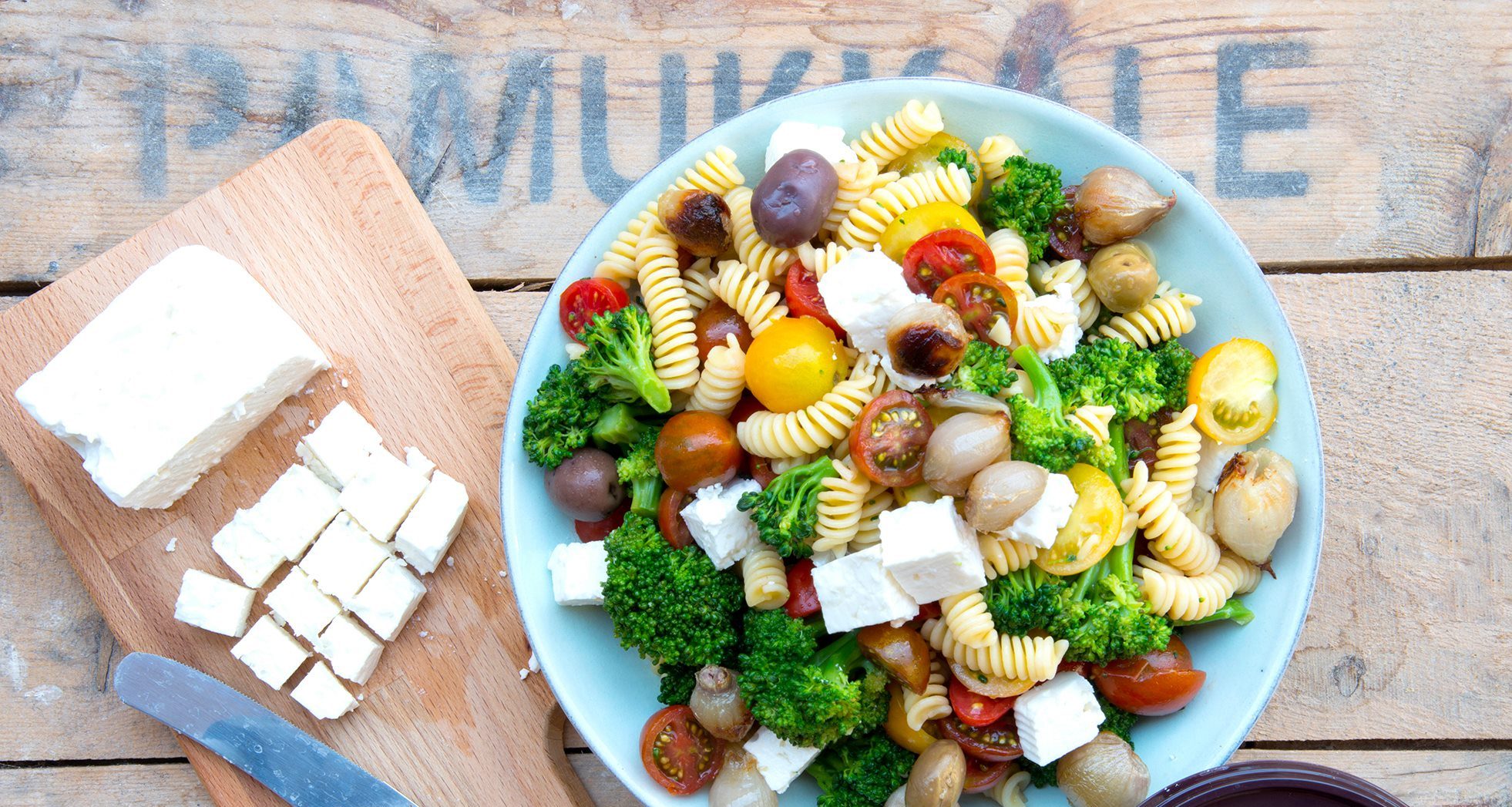 סלט פסטה עם בצלצלים, ברוקולי, עגבניות שרי, זיתי קלמטה וגבינת פטה כבשים