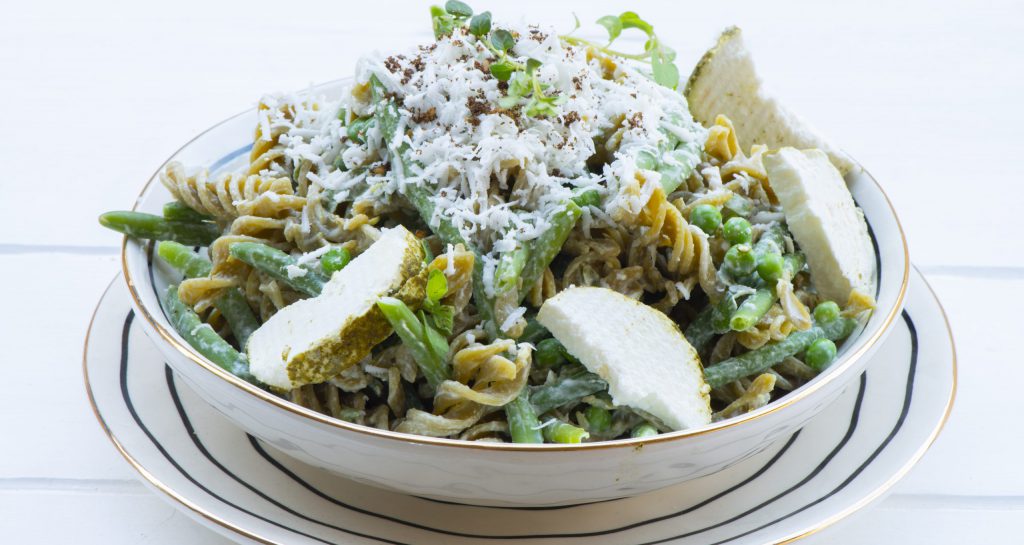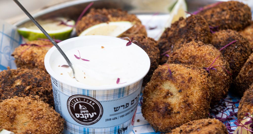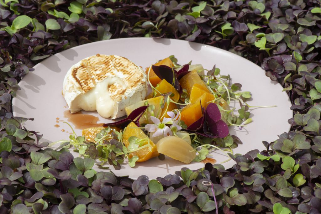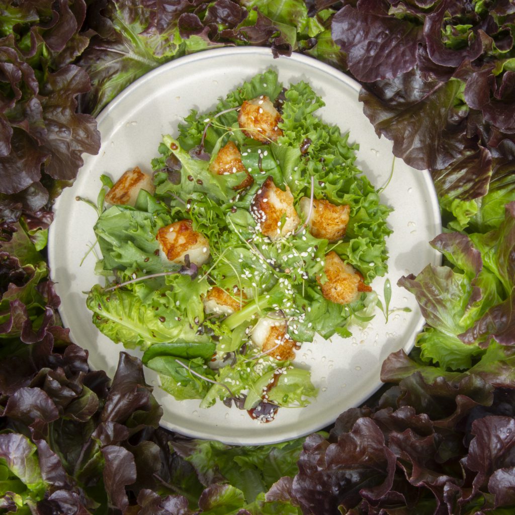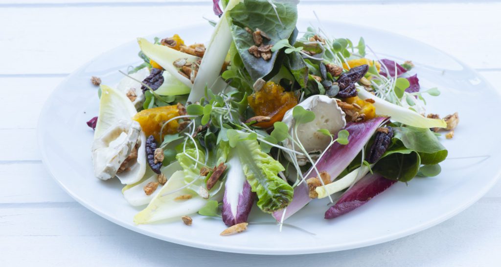סלט בייבי תרד, קוביות ארטישוק ירושלמי דפי גבינת פקורינו ושקדים מקורמלים ברוטב הדרים- מתכון של מתי חולון