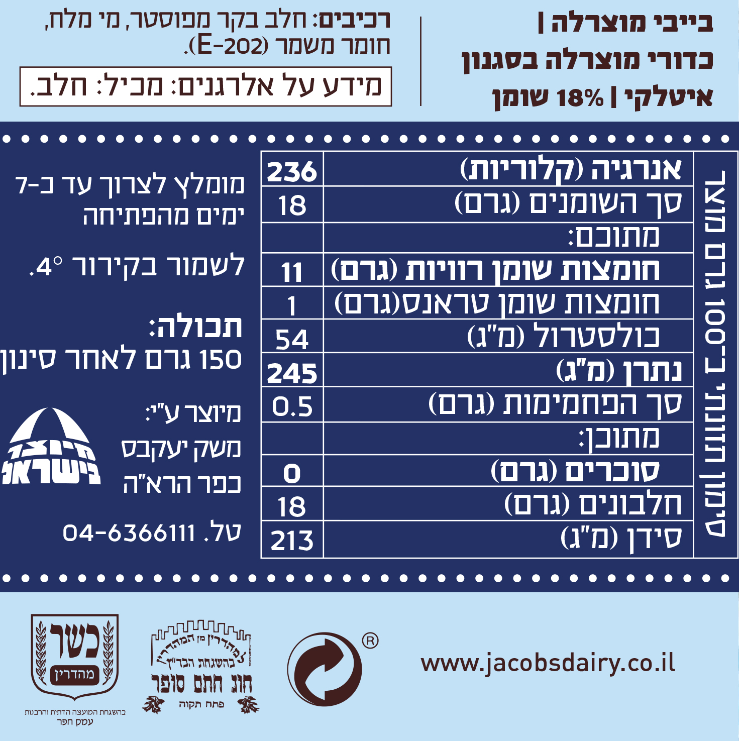גבינה טרייה רכה מחלב בקר בסגנון איטלקי. בעלת טעם עדין. 18% שומן.