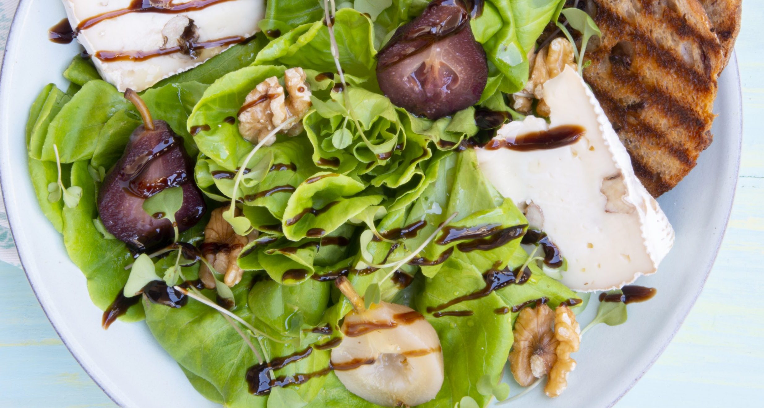 סלט ירוק שמורכב מסלנובה שלמה, מיקרו ברוקולי, אגסים ביין לבן ואדום, קממבר אגוזים עם רוטב בלסמי ואגוזי מלך.