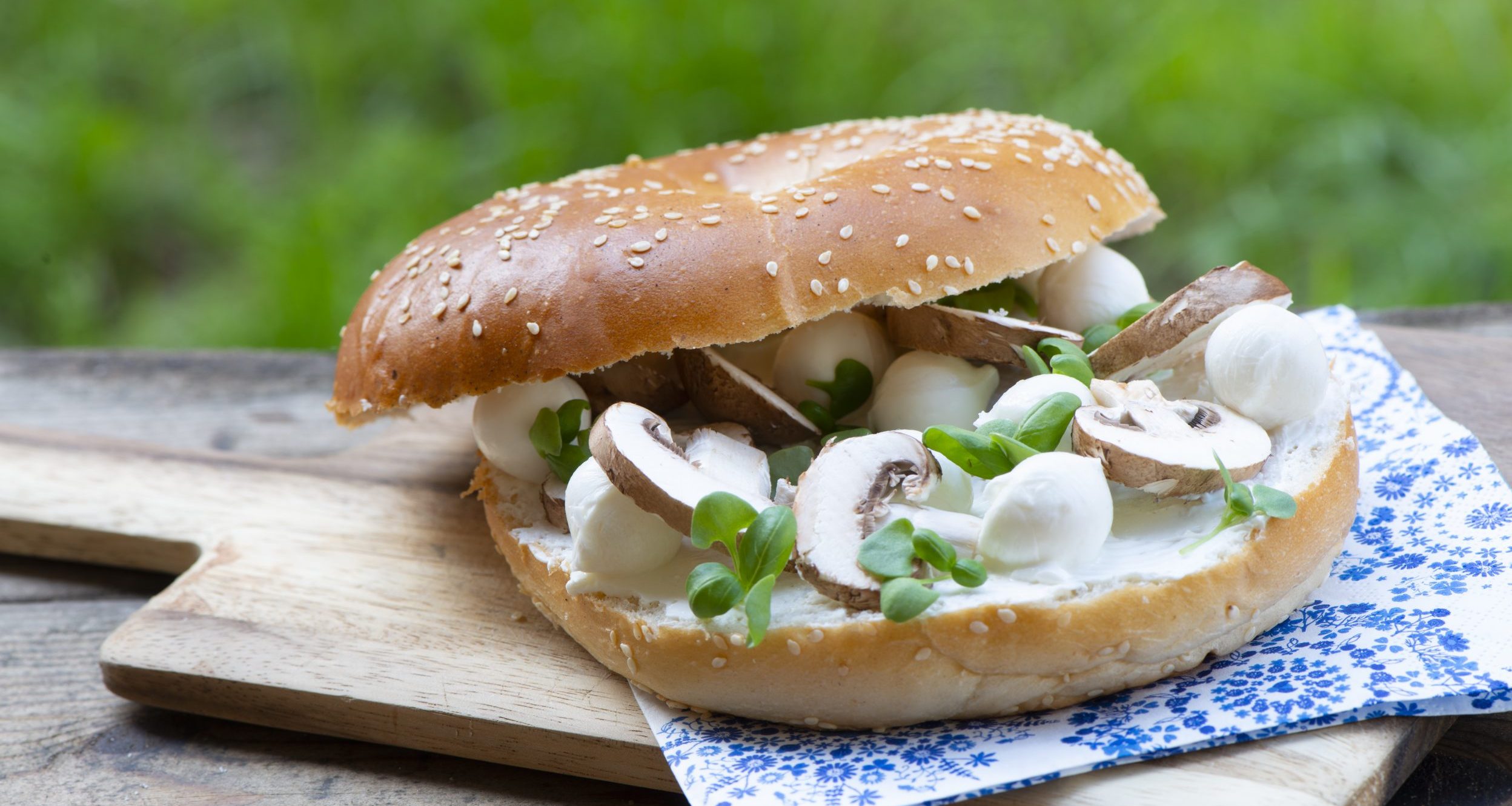 בייגל עם גבינת לאבנה, בייבי מוצרלה, פטריות ועלי מיקרו