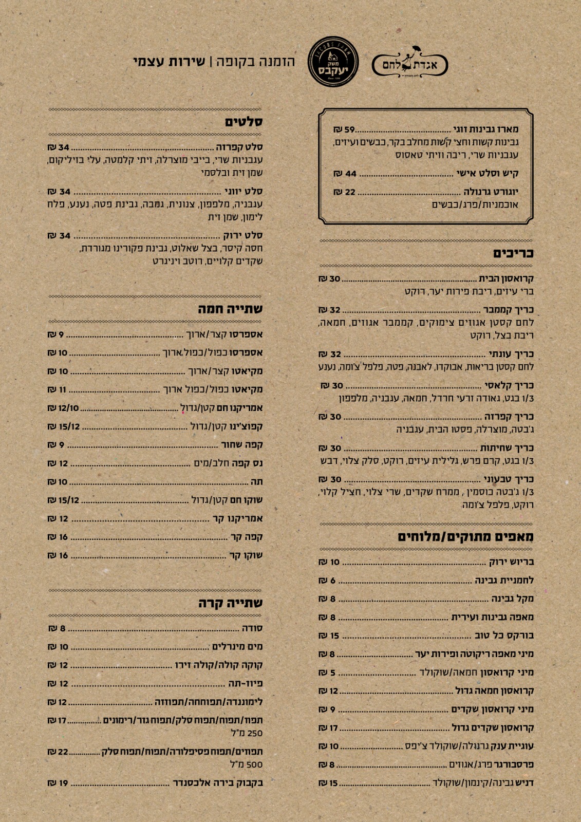 בית הקפה שלנו מציע מנות שמתבססות על תוצרתנו הטרייה. כריכים שנעשים מלחמים של אגדת לחם, גבינות יעקבס, ירקות וממרחים טריים. מאפים של אגדת לחם, מגשי גבינות, סלטים, שתייה חמה וקרה. הישיבה בבית הקפה מתאפשרת גם בחלל הכניסה שהוא ממוזג, ויש גם ישיבה בחוץ, אין הזמנת מקומות מראש.