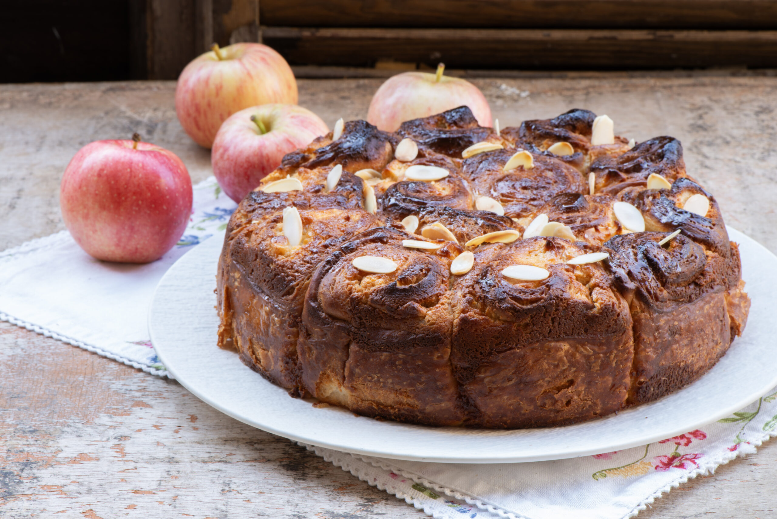 מרדדים את הבצק למלבן בעובי 4 מ”מ. מורחים מחצית מתערובת הגבינה על כל מלבן (מקפידים להשאיר שוליים נקיים), מפזרים מחצית מקוביות התפוחים ומגלגלים לגלילה.