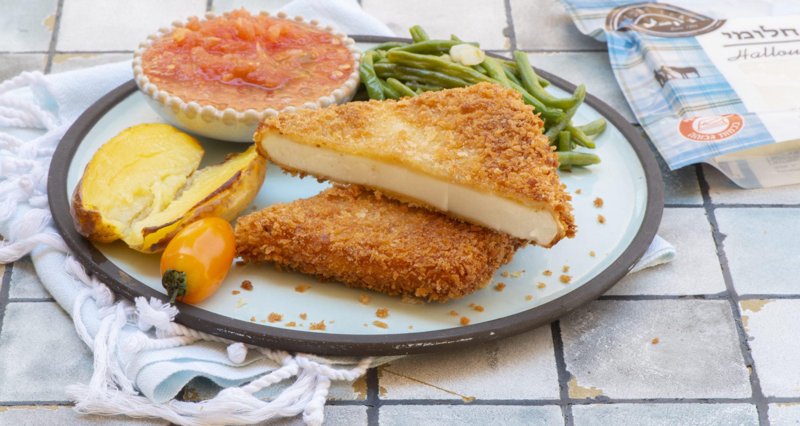טובלים ריבוע של גבינת חלומי של יעקבס (200 גרם) בקמח רגיל, ביצה ובפאנקו (פירורי לחם יפנים), מטגנים בשמן כמה דקות מכל צד.