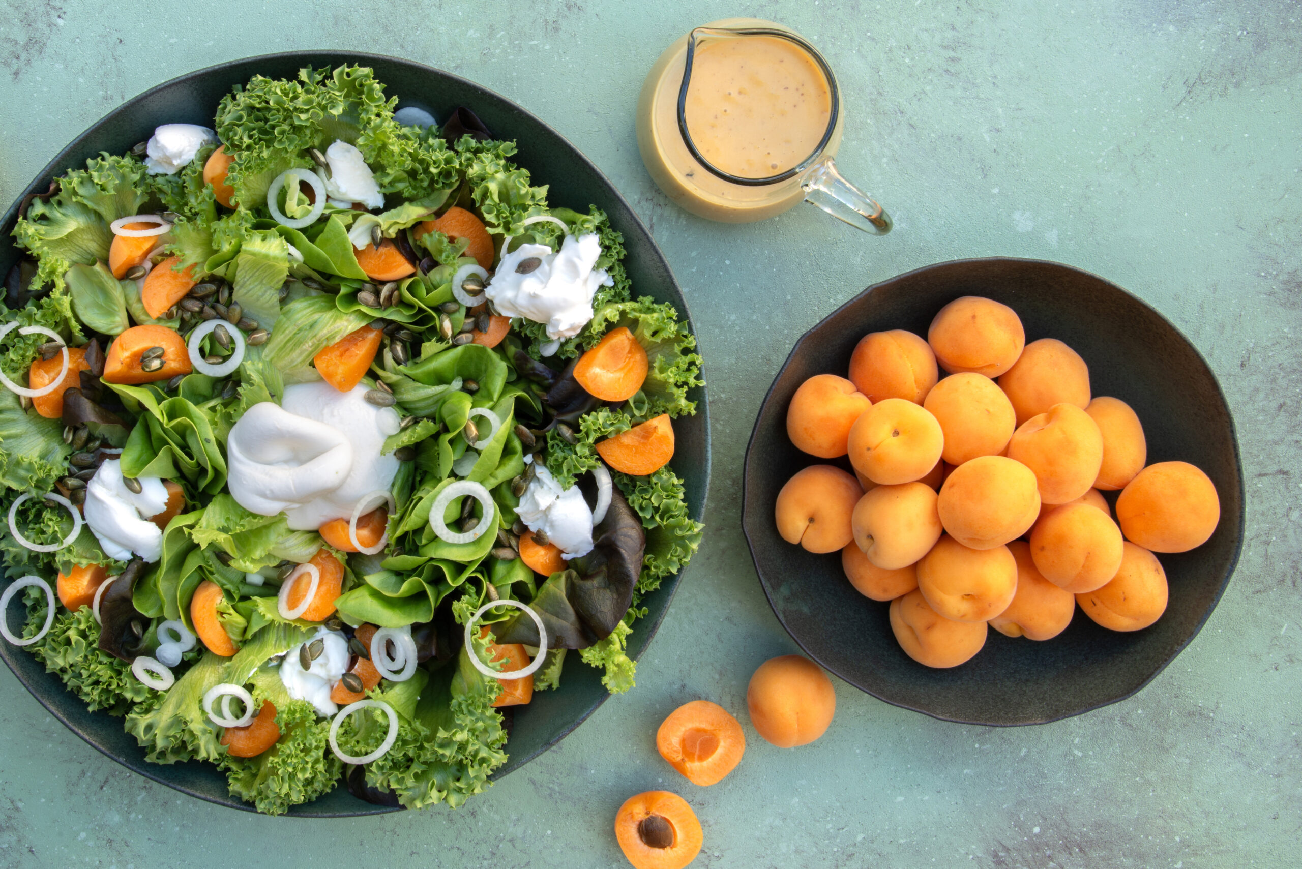 חסה לליק וחסה סלנובה, גבינת בוראטה, משמשים, טבעות בצל, גרעיני דלעת.