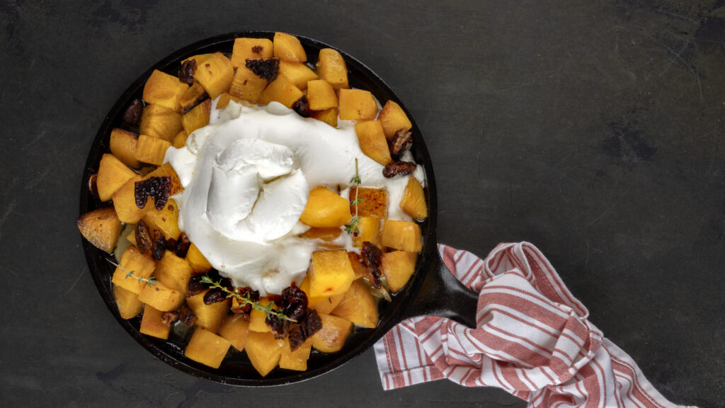 סלט בוראטה ואפרסמון מוקפץ בחמאה, שום, טימין ופקאן מסוכר