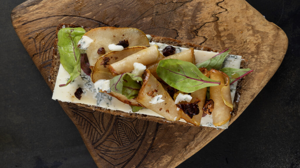 כריך רוקפור עם אגסים מקורמלים בחמאה וסוכר חום, פקאנים קראנצ׳יים ועלים רעננים