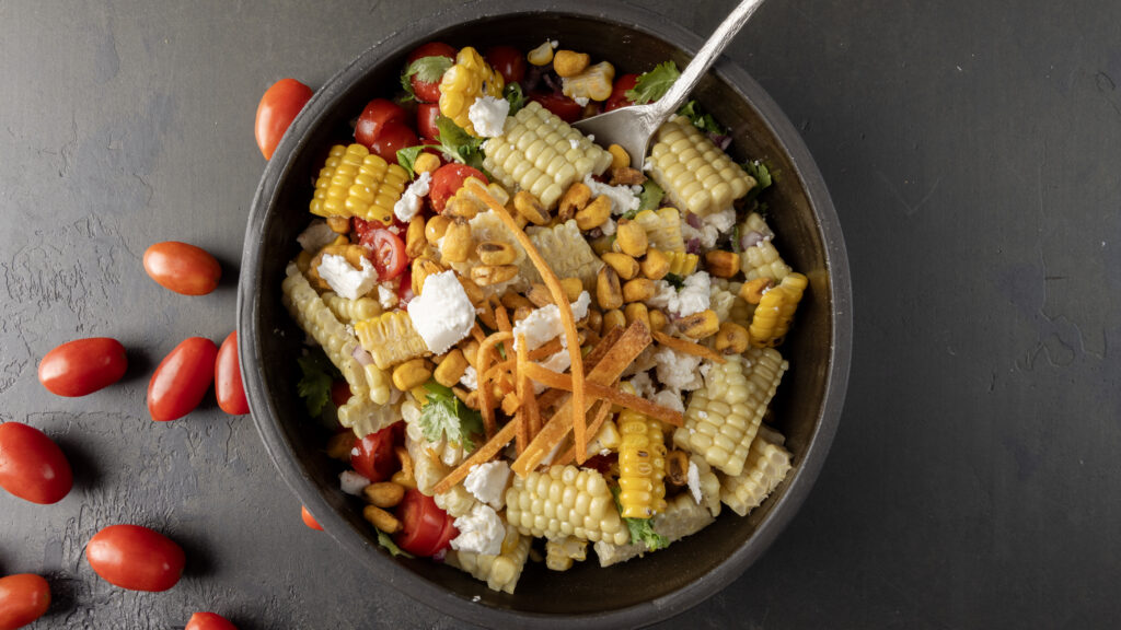 סלט תירס עם גבינה בולגרית, עגבניות וקראנצ'ים של טורטייה