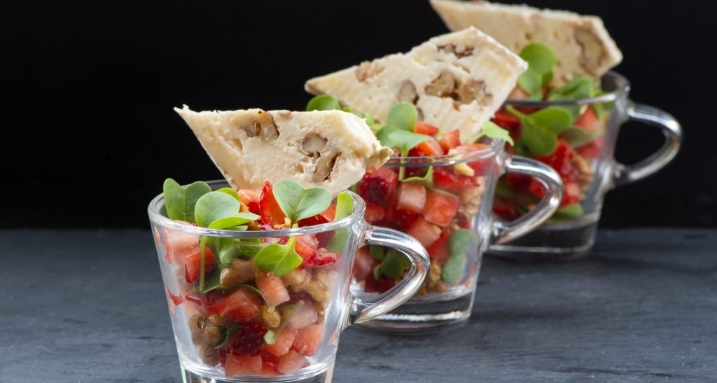 סלט בייבי תרד, קוביות ארטישוק ירושלמי דפי גבינת פקורינו ושקדים מקורמלים ברוטב הדרים- מתכון של מתי חולון