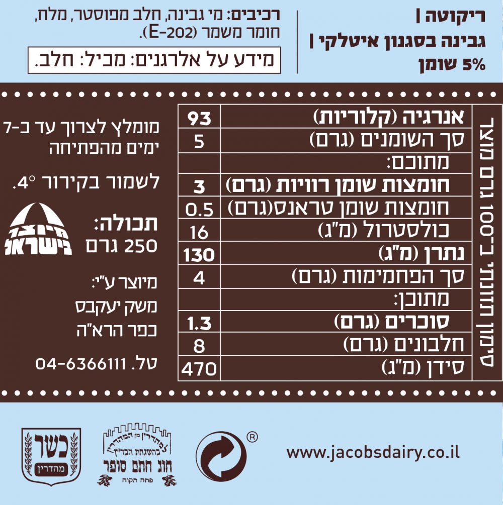 גבינה רכה מחלב בקר המיוצרת ממי-גבינה בתהליך בישול מסורתי. הגבינה דלת שומן ועשירה בסידן ובמינרלים. 5% שומן.
